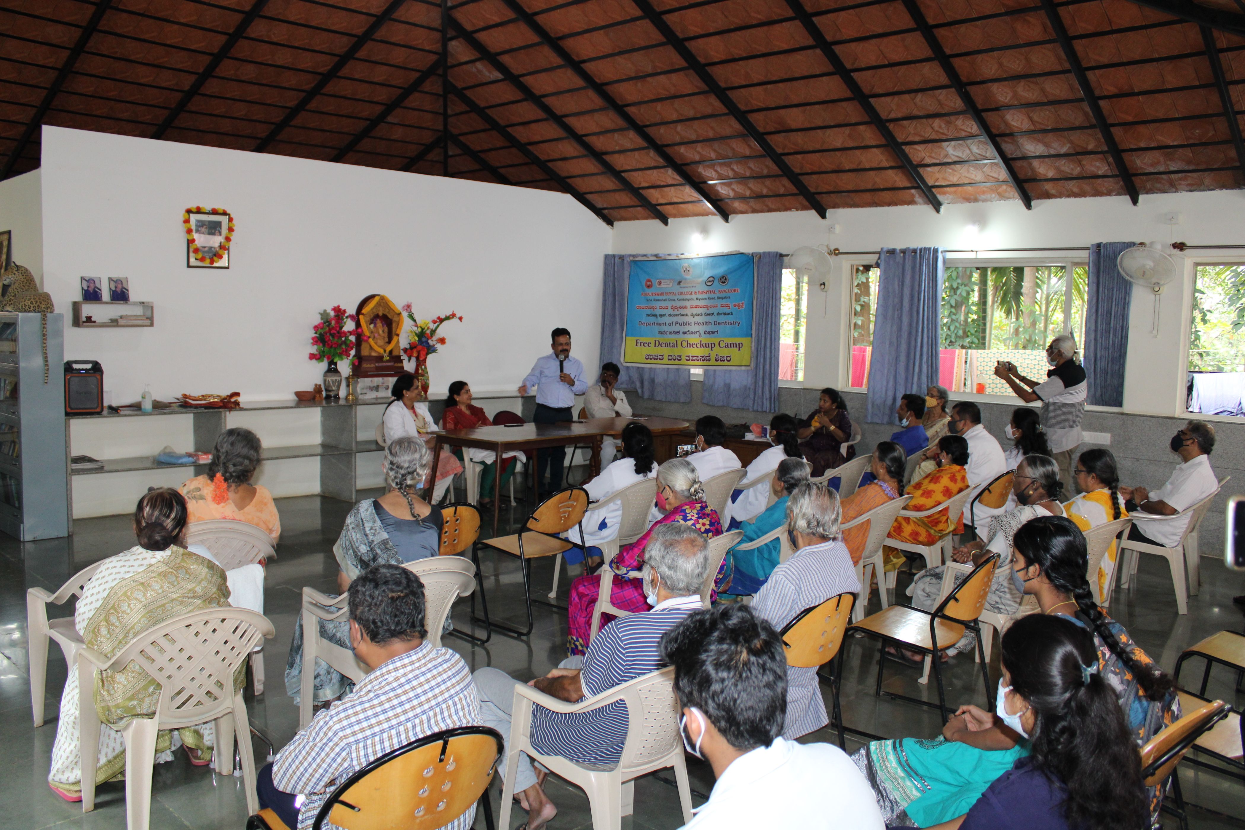 We reached the serene premises of the old age home around 10AM. The programme was graced by the presence of Dr.Rajkumar.S. Alle, Principal, RRDCH, Dr.Padma k Bhat ,Head of Public Health Dentistry , Dr.Shwetha Poovani , Head of Prosthodontics Department and Mr. Krishna Murthy, Director of Mathruchaya Trust.