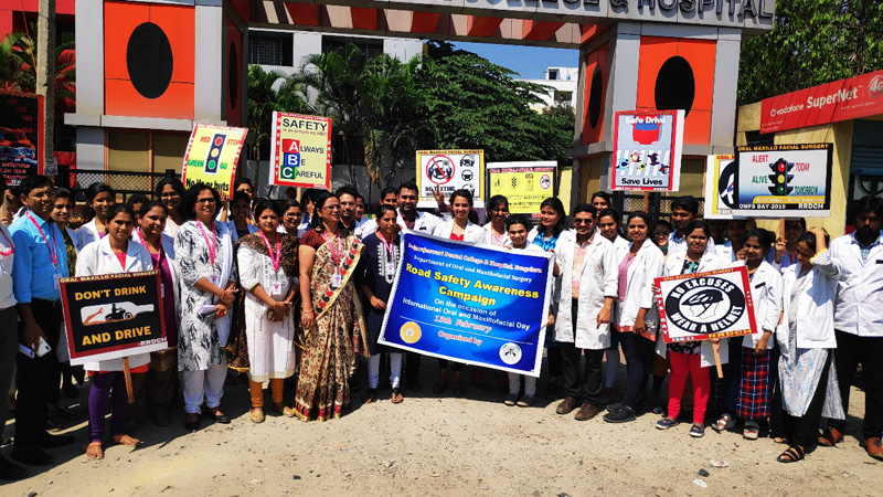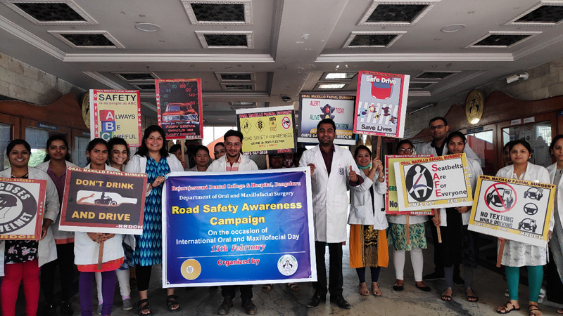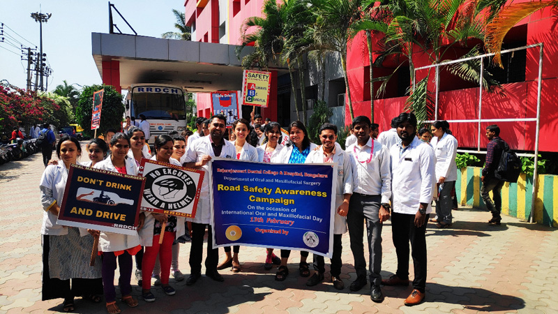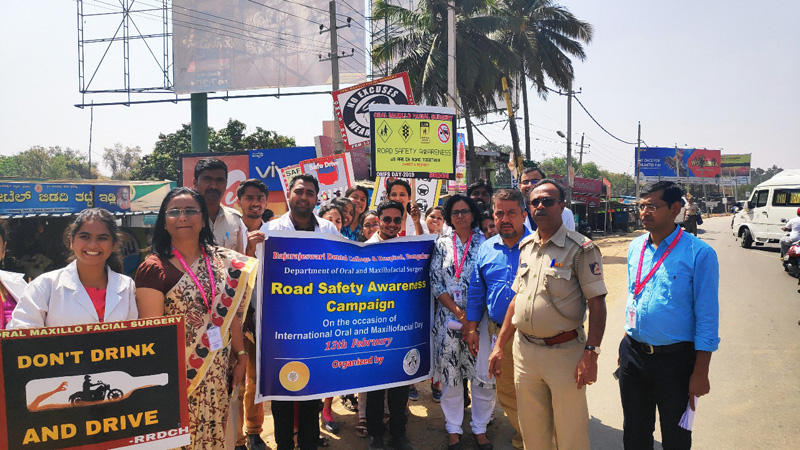 As a part of International Oral and Maxillofacial Day celebration, The Department of OMFS, Rajarajeswari dental college and hospital conducted a campaign at Ramohalli cross on Road Safety Awareness with the co-operation of the Kumbalagodu traffic police. All the staffs, post graduates and interns from the department of OMFS actively participated adding upto a total number of 50-60 doctors. It was well organized and successfully completed.