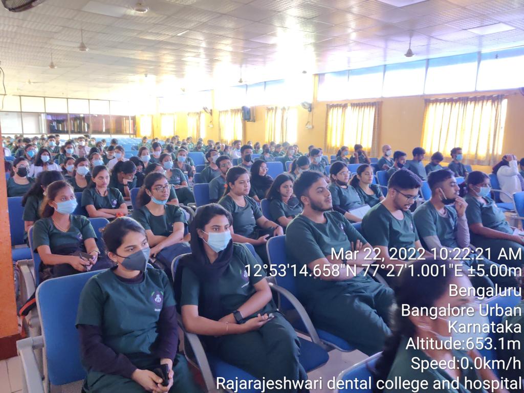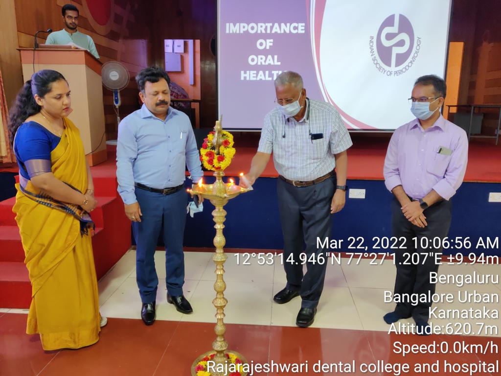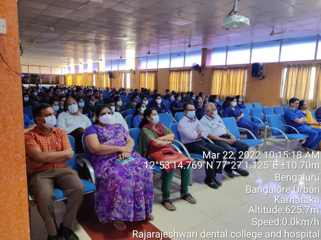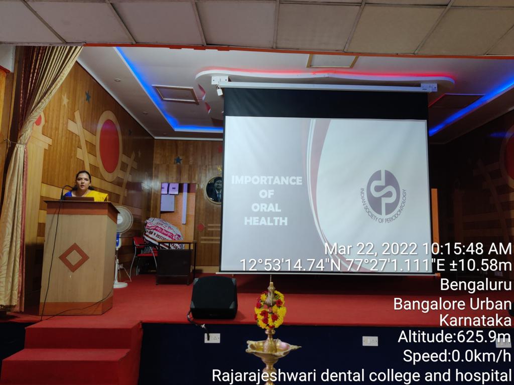 On the occasion of world oral health day, the department of Periodontology and Public Health Dentistry of Rajarajeshwari dental college & hospital in association with ISP (Indian society of periodontology) organized a program on the topic “IMPORTANCE OF ORAL HEALTH” for 4th BDS and INTERNS. The speaker was Dr. NALINI M.S, PROFESSOR Department of PERIODONTOLOGY who discussed about importance of oral health, prevention, how periodontal disease affects overall health, various oral hygiene aids.